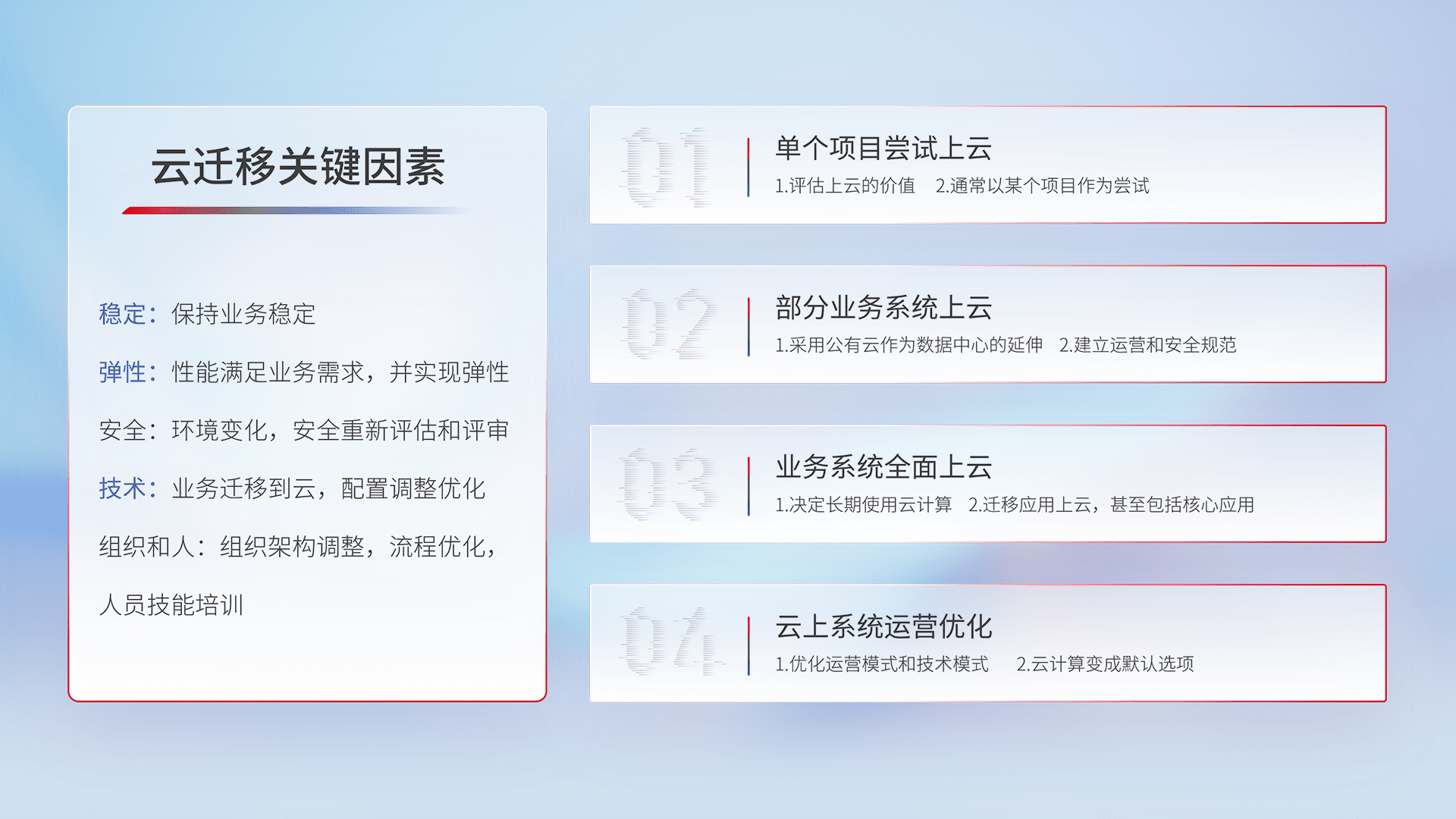结合实际业务,,从规划设计、、、云平台选型、、、、云原生改造、、、数据迁移、、、集成交付,,迁移全过程为客户识别最佳上云路径,,做好风险识别管理,,,设计网络架构、、、身份权限、、安全审计合规、、、操作审计、、、、日志审计、、、监控告警策略、、多站点容灾设计等,,对云上基础设施进行整体规划,,,,提升IT治理水平,,,以满足弹性、、高可用、、高性能的需求。。